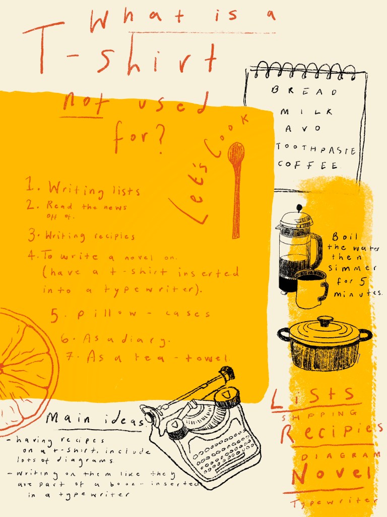 For my bedroom I want to create designs and print them onto t-shirts. The idea came to me when I saw a T-shirt with a printed recipe for how to make pasta. I wanted to alter the way we use everyday objects by giving them another narrative. So I started off by listing the very things at-shirt could possibly not be used for – from the top of my head, writing lists, reading the news off of, for keeping recipes, writing a novel on, pillow cases, as a diary and as a towel. The main ideas that stuck with me are the recipes and the novel.