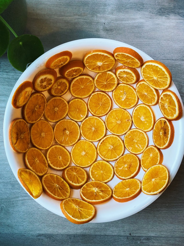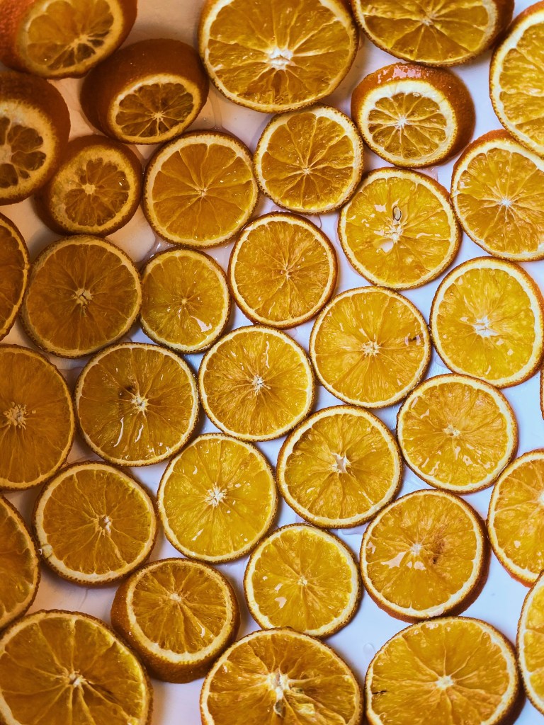 I started off by greasing a bowl with the desired shape of the lampshade with Vaseline. Once the bowl was covered, I started by placing an orange slice in the centre of the bowl and added another one . With clear glue, I put a drop where the two slices touched. I then repeated this process and worked my way out, giving the effect as shown in the images above.