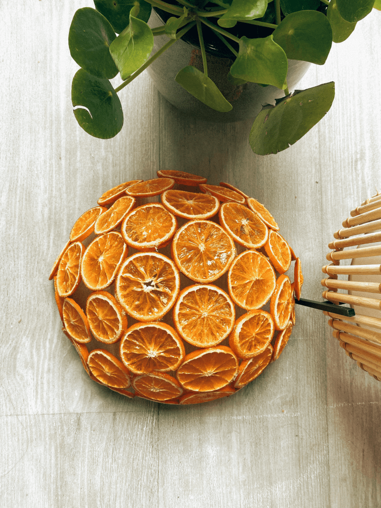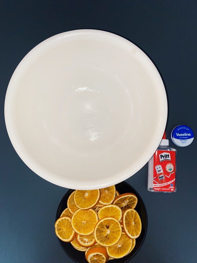 Once the glue had dried, the Vaseline I had applied to the bowl made it extremely easy to slide the connected oranges out of the bowl. I then places the structure onto another bowl to stick on any remaining oranges to complete the shape of the lampshade.