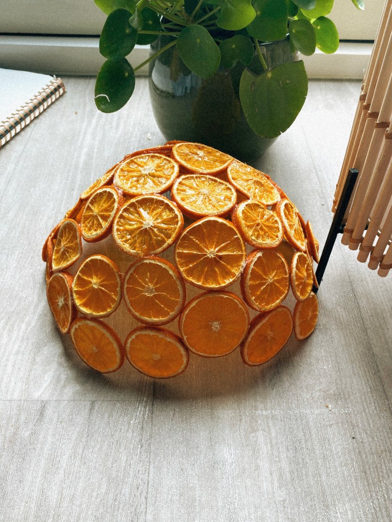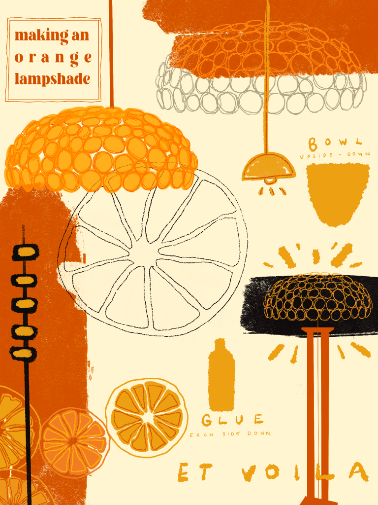I know that the aesthetic of the room is very important to me. I want it to be inviting, I want there to be a warmth within the room. I could just by a warm light a put it in the corner of the room but, I could also make the light a piece of art work itself. I could make a lampshade that emits the warm colour throughout the room – a lampshade… made from oranges…