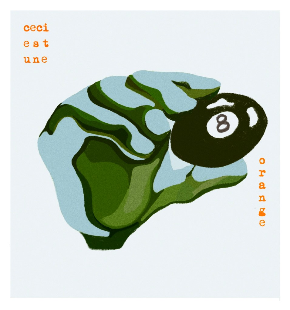 Whilst Magritte states that an image of a pipe is in fact not a pipe, I tried to flip the narrative and state that an 8 ball is an orange. I am also referencing Paul Eluard’s poem La terre est bleue comme une orange (The earth is blue like an orange). It is a metaphor that can appear to be absurd, but ends up imposing its legitimacy. Both the earth and the orange have a spherical structure. The colour blue carries happiness – as it is linked to the blue of the sky, to the air and to the ideal. The earth is compared to an orange – a fruit that is rich and full of life. The ideal earth appears as a beautiful fruit – it has its round shape, its fragrance and its fullness. Throughout Paul Eluard’s works, we find surrealist characteristics, such as love, poetry and the unusual combination of words.