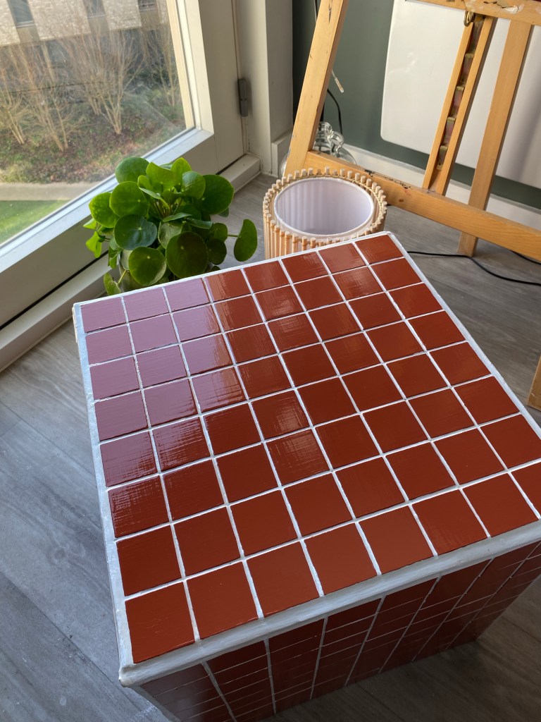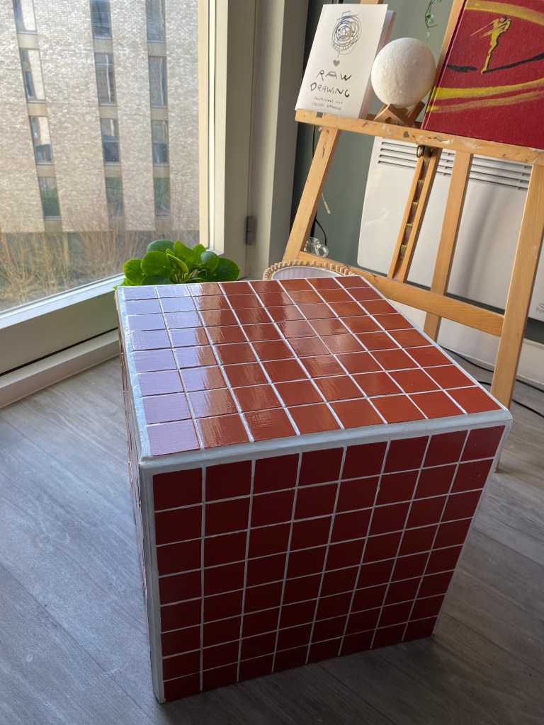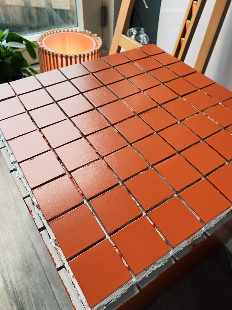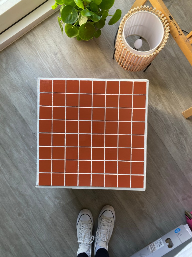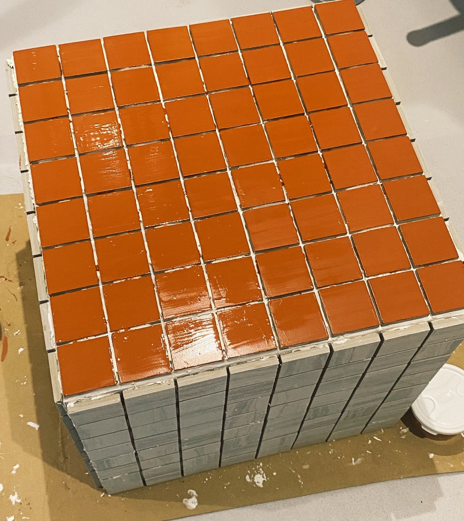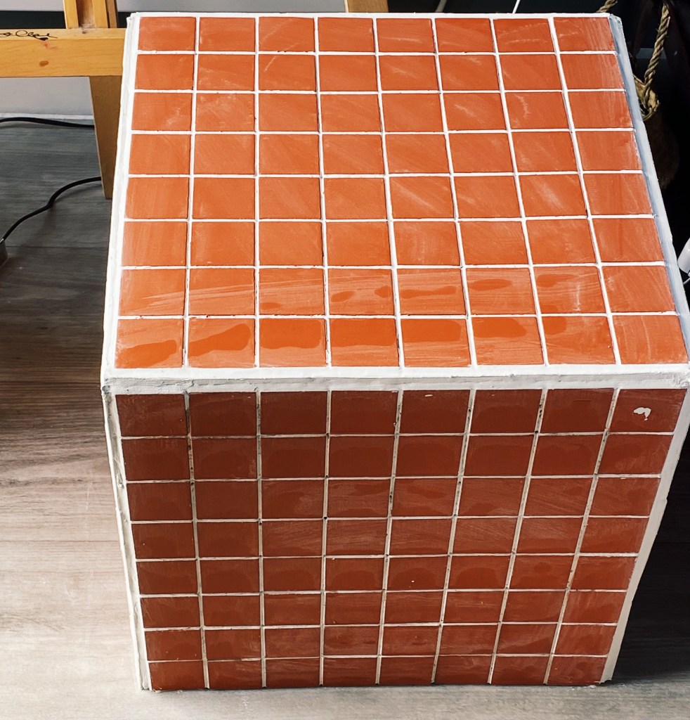 I then applied the grout onto a quarter of one side, so that I had time to apply tiles before it dried out. I then used a grout applicator – with the flat side I evened out the grout and with the other grooved side I pulled it through the brought in wave-like motion so that the tiles could have something with friction to stick to. I then applied grout on the back of the tile and cataclysm it to the box. To ensure even spacing between the tiles along the entire box, I used 3mm tile spacers. 320 tiles each individually applied later I was finished. Next was onto painting. I mixed two different colours of tile paint to create the colour I wanted. Thinking about the aesthetic of the room and what colours would be in there I decided to go for a burnt orange colour. I lightly sanded down the tiles and washed over them getting rid of any left over grout, allowing for an even application.