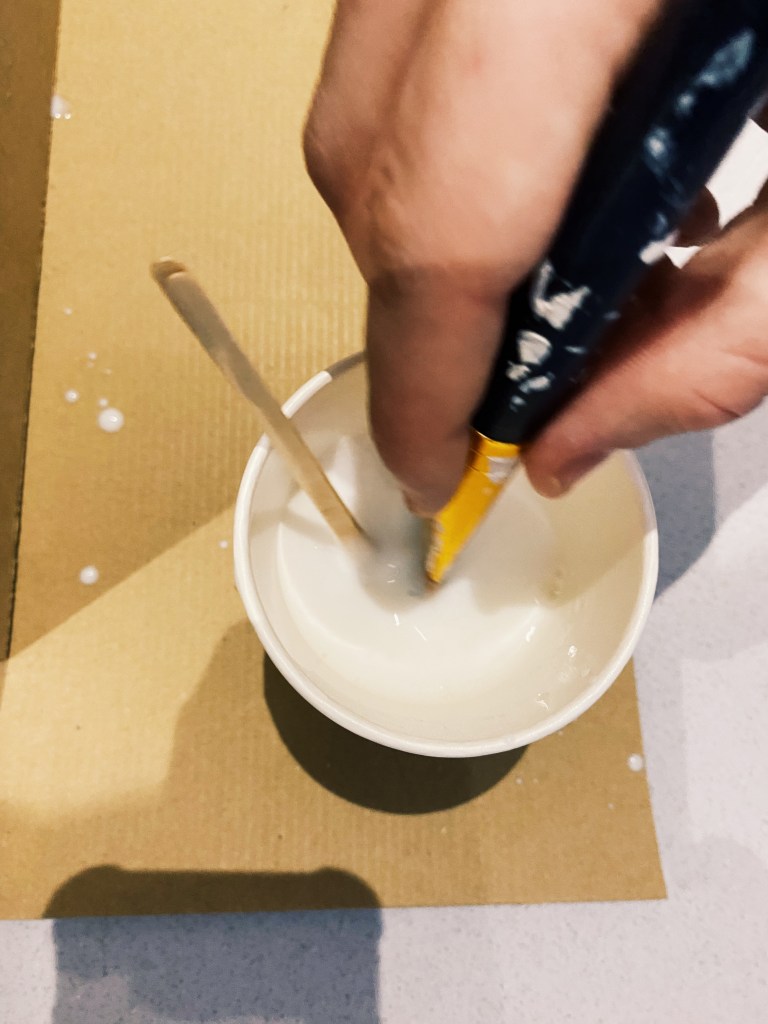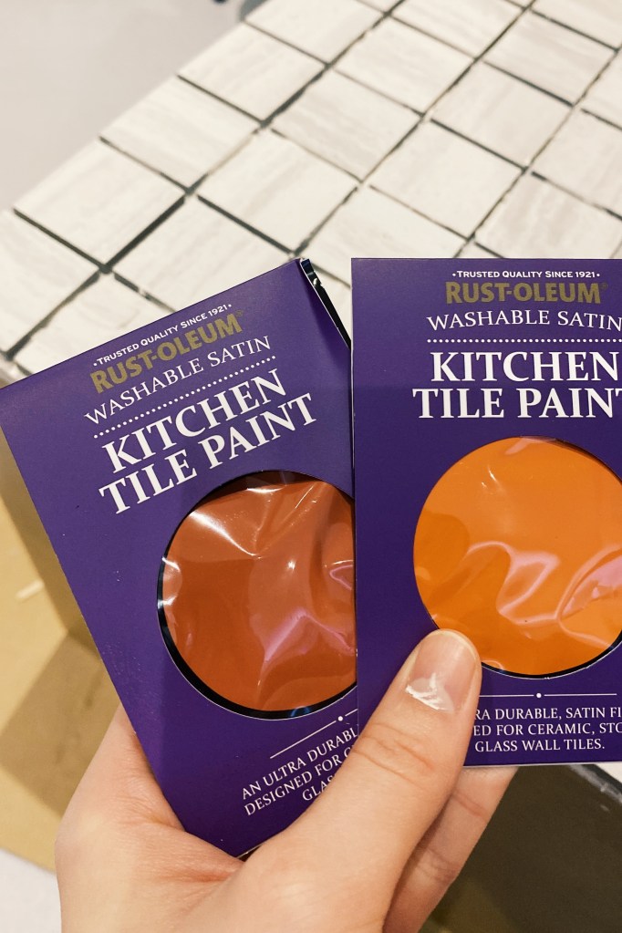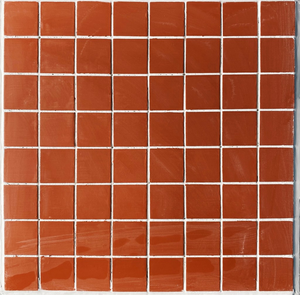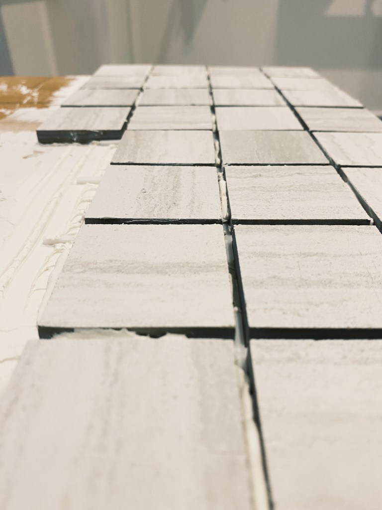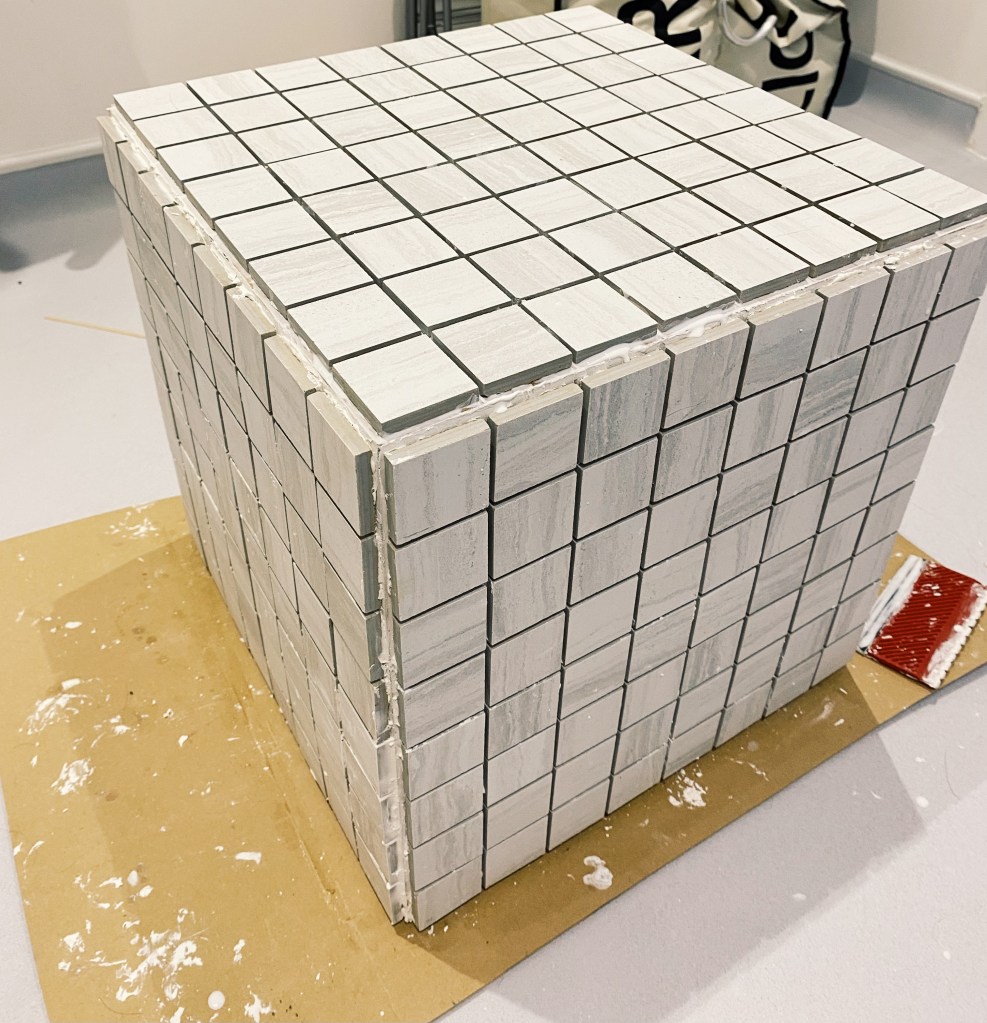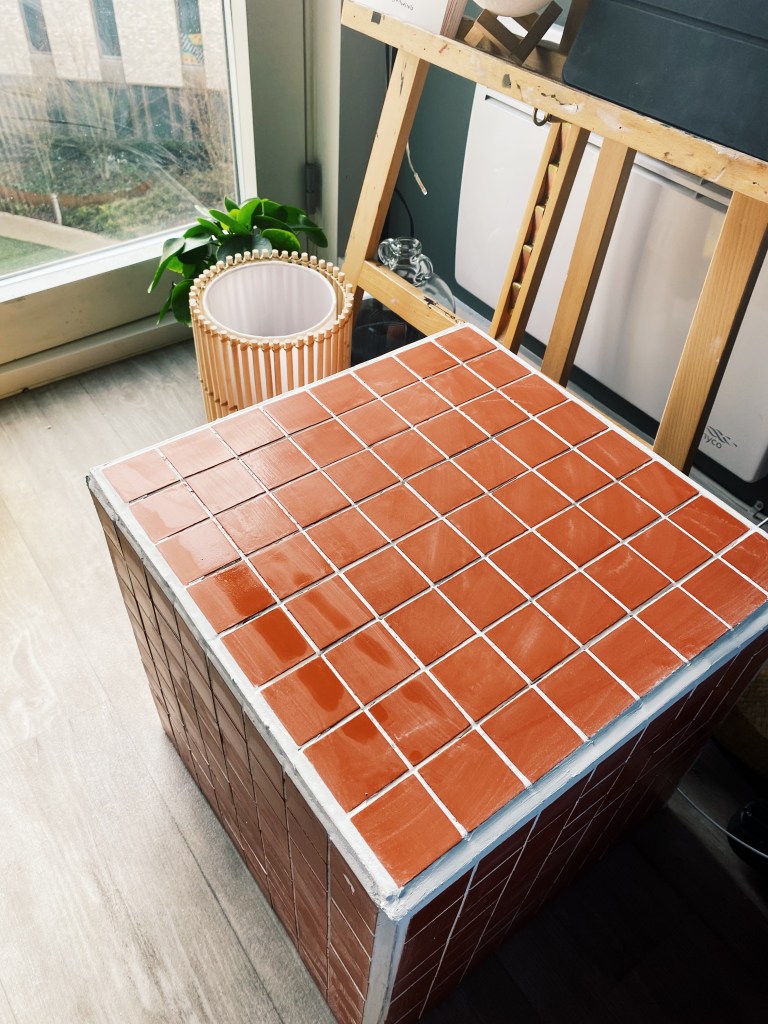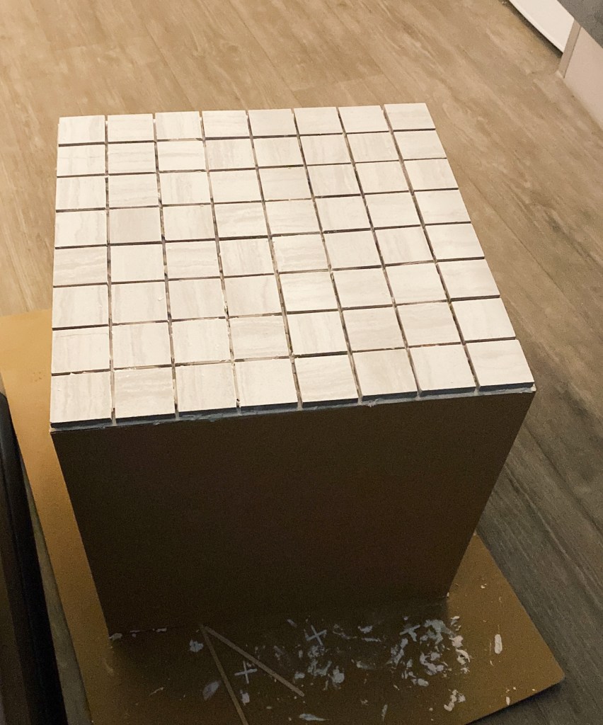 I then applied the grout onto a quarter of one side, so that I had time to apply tiles before it dried out. I then used a grout applicator – with the flat side I evened out the grout and with the other grooved side I pulled it through the brought in wave-like motion so that the tiles could have something with friction to stick to. I then applied grout on the back of the tile and cataclysm it to the box. To ensure even spacing between the tiles along the entire box, I used 3mm tile spacers. 320 tiles each individually applied later I was finished. Next was onto painting. I mixed two different colours of tile paint to create the colour I wanted. Thinking about the aesthetic of the room and what colours would be in there I decided to go for a burnt orange colour. I lightly sanded down the tiles and washed over them getting rid of any left over grout, allowing for an even application.