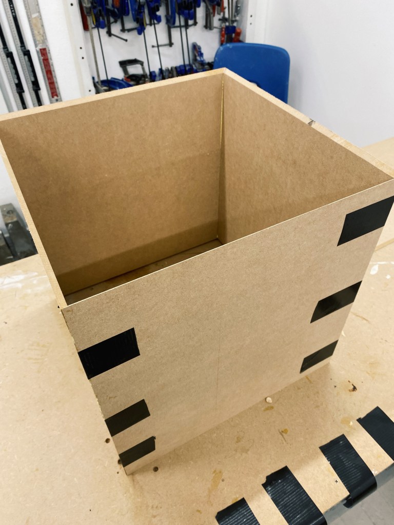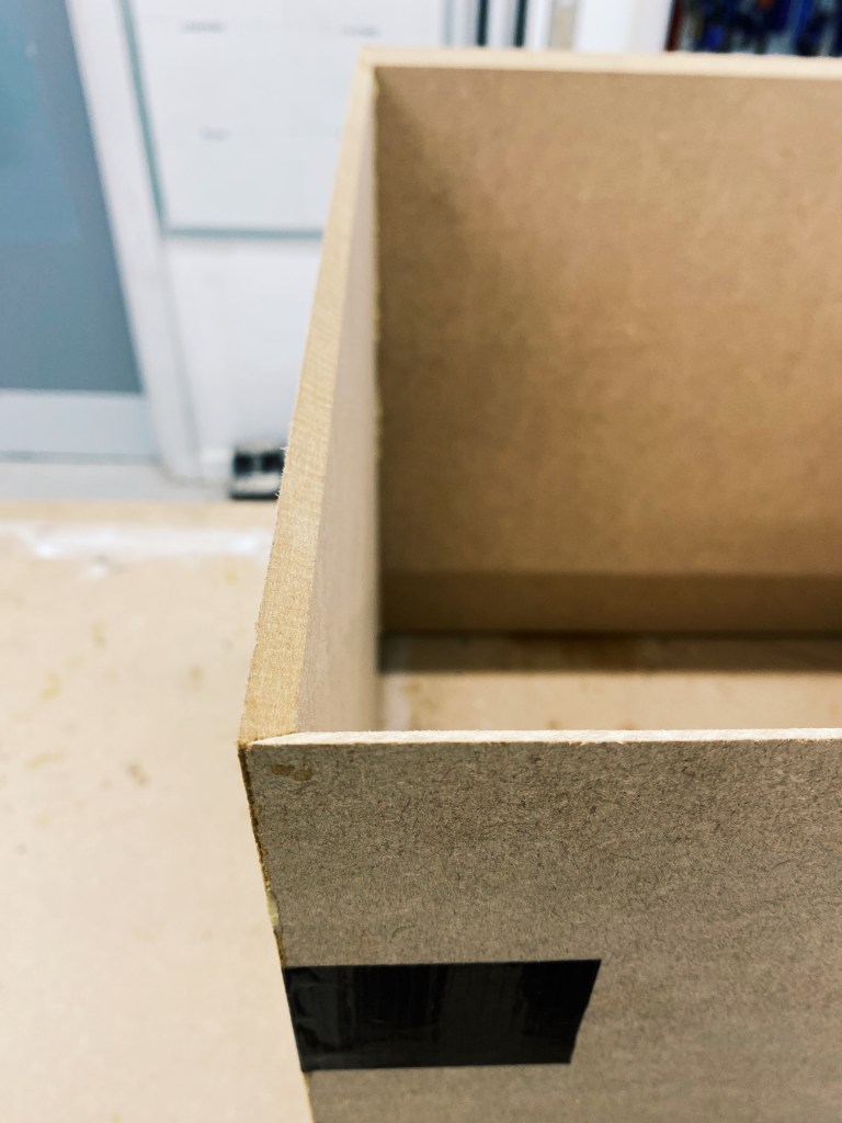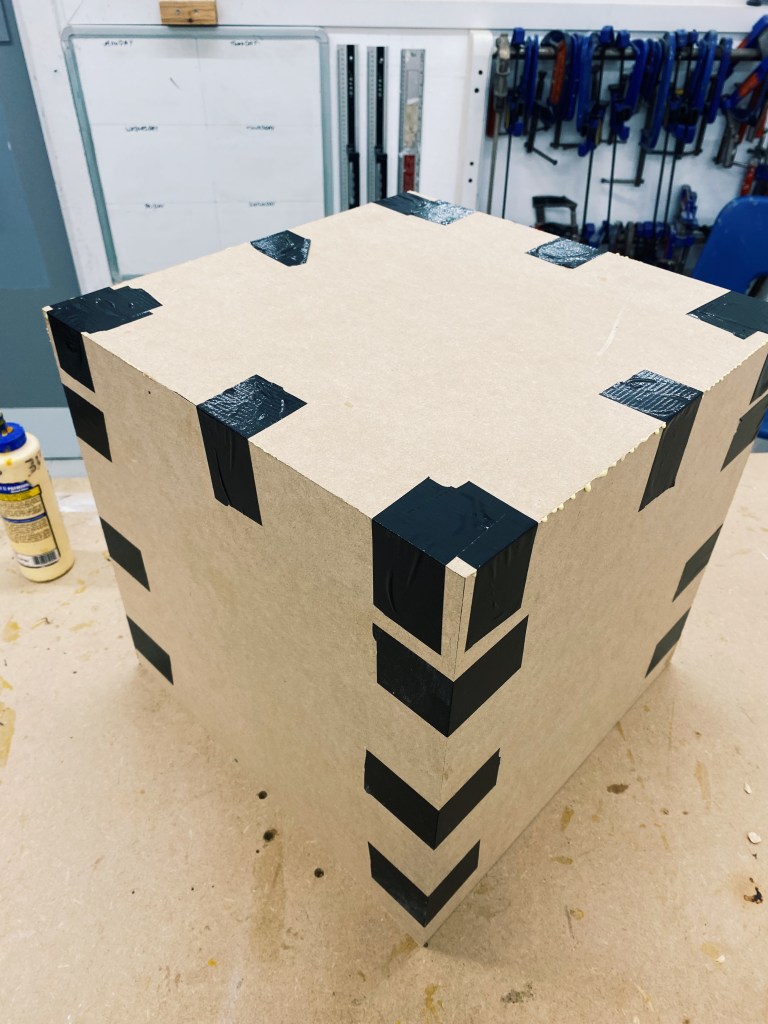 I started this process very wary as I have never done anything like this before. So I reached out to the 3D workshop sending them the images above explaining my idea and asking how I could go about this. So I went in and had the wood cut with metered edges so they fit together perfectly without losing length on the box. I then lied 4 pieces of 6mm MDF one next to the other on the workbench and taped where they each met with each other. Once I did each intersection and stood the pieces up, they easily folded into a box. Once the box had taken form, we applied glue along each of the intersections, which we later did to the lid of the box as well. The box was then sanded to get rid of any of the glue that had leaked through.