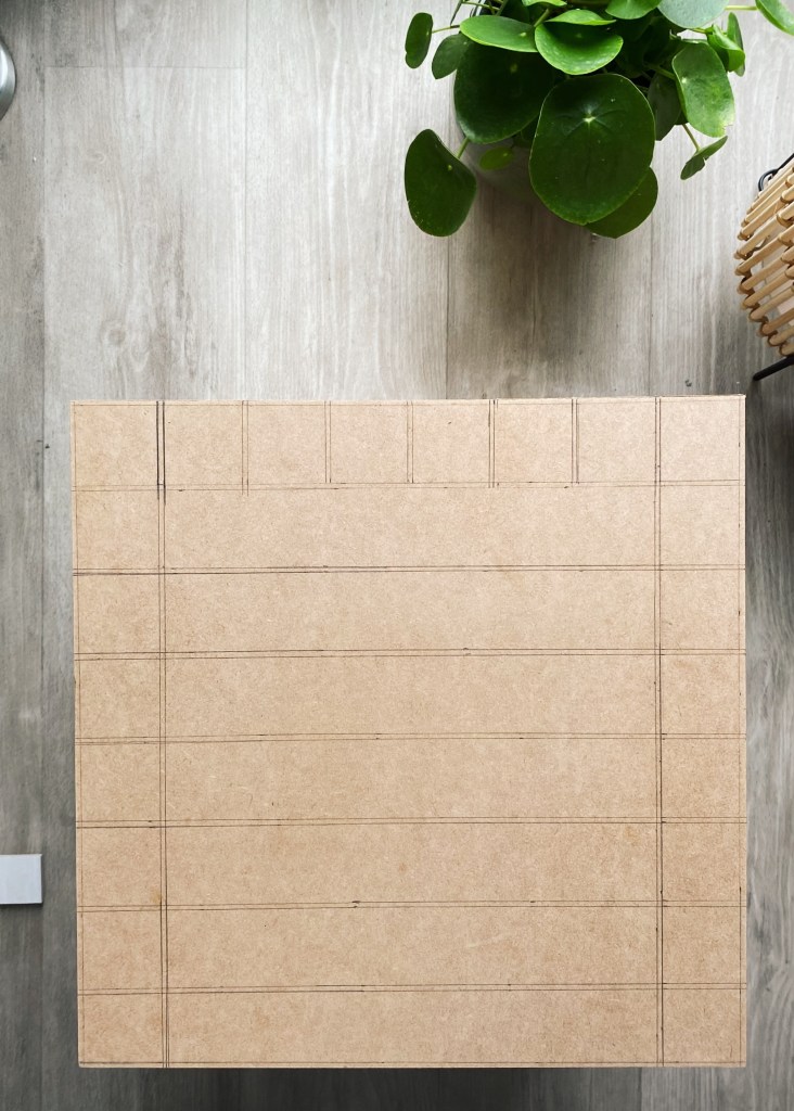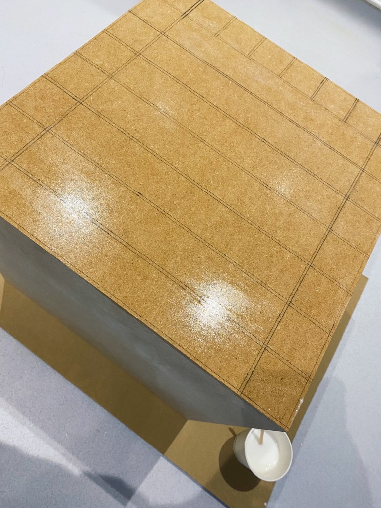 Seeing as I already had the tiles and measured the wood according, I wanted to make sure that my calculations were correct, so I drew a grid and placed the tiles on top – thankfully it was all going according to plan. Next I needed to seal the wood so that when it came to applying the grout, the wood would have a barrier preventing the wood to soak any water the grout held. The mixture I used to seal the wood, was made from PVA glue and water, of which I applied 3 coats over the entire box.