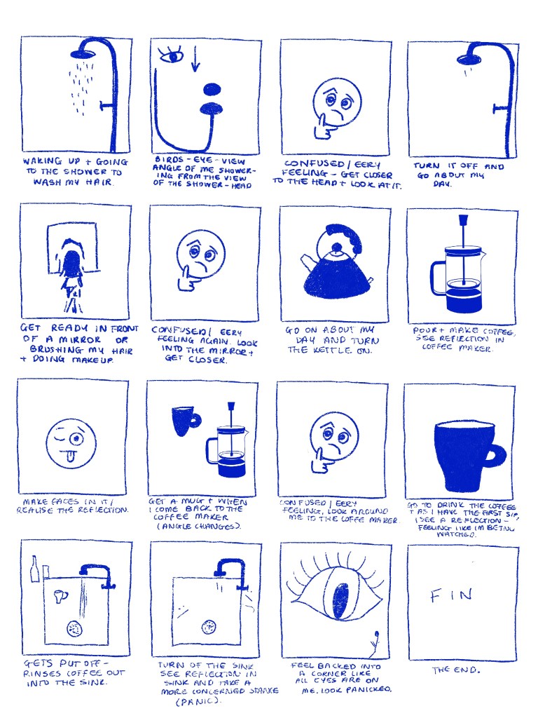 Below is a storyboard I have come up with while including the initial idea of viewing things differently and seeing how objects can alter reflections.