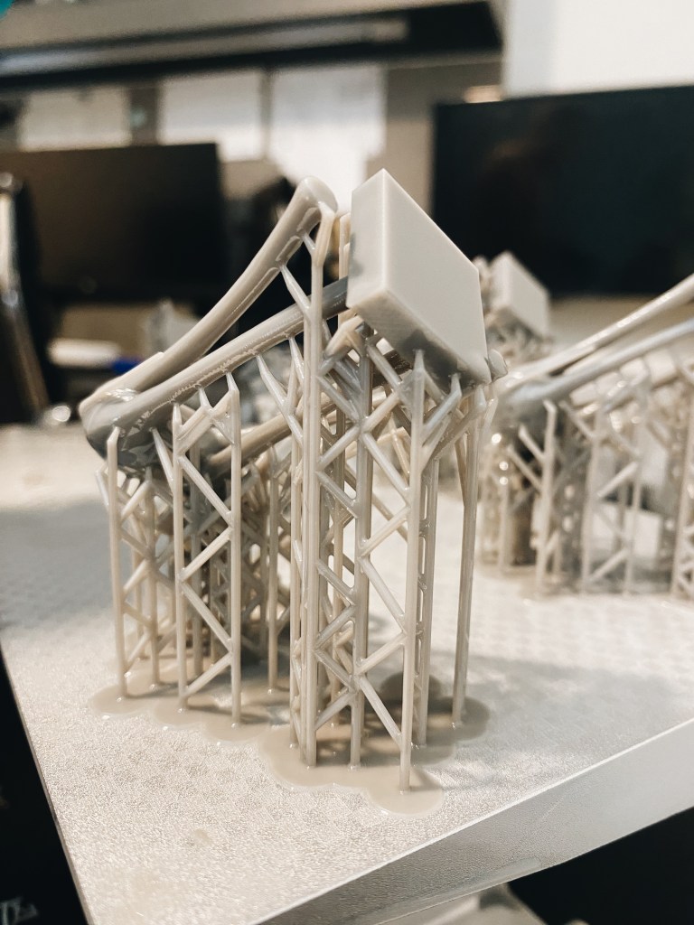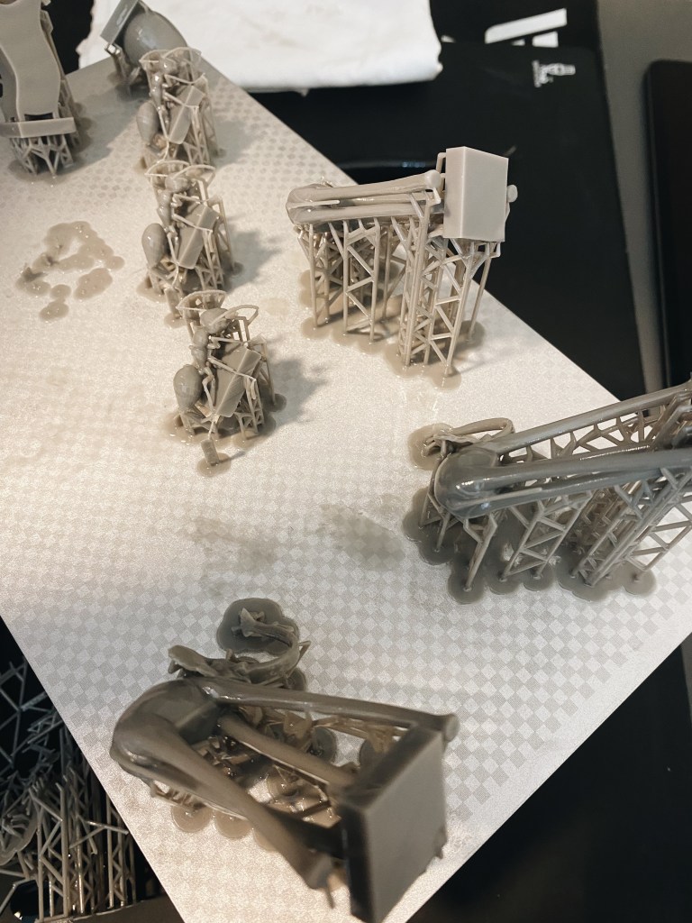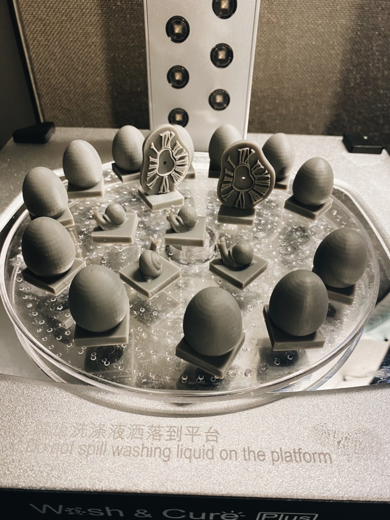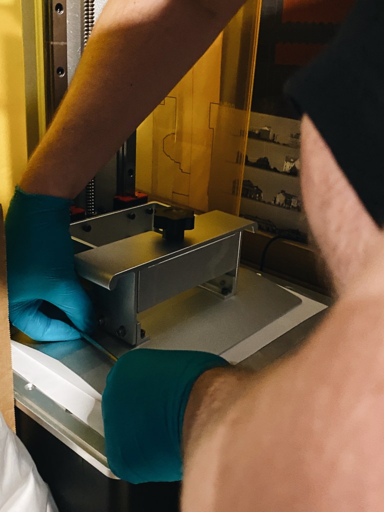 The process to actually making the pieces, started by mixing and loosening the resin in the vat and place it in the printer and tighten the plate. Then on the screen, we were able to see how and where on the plate they would print and how long it would take. These took roughly 5 hours to all print.