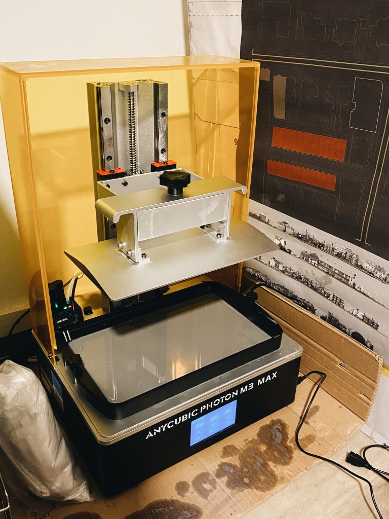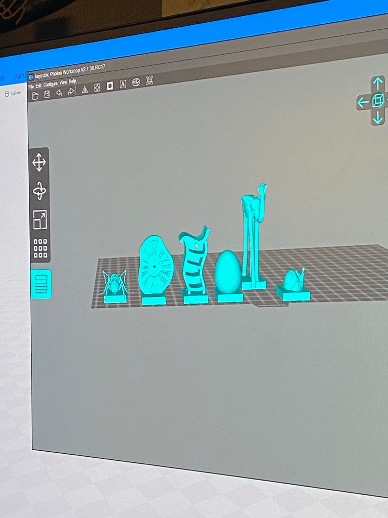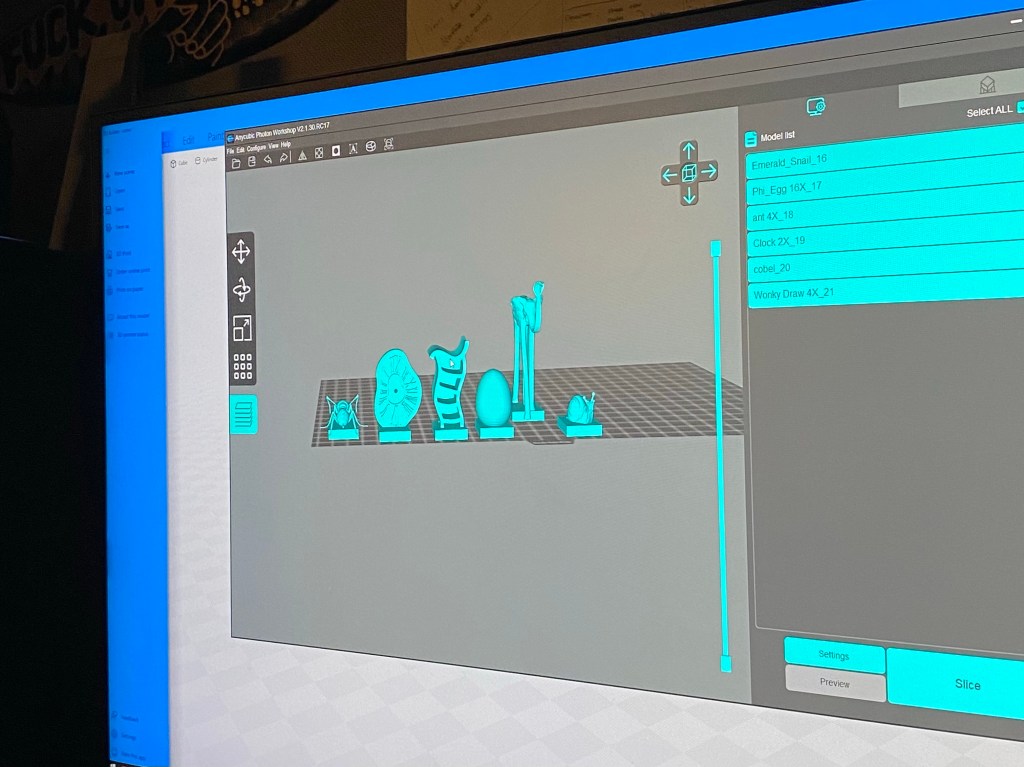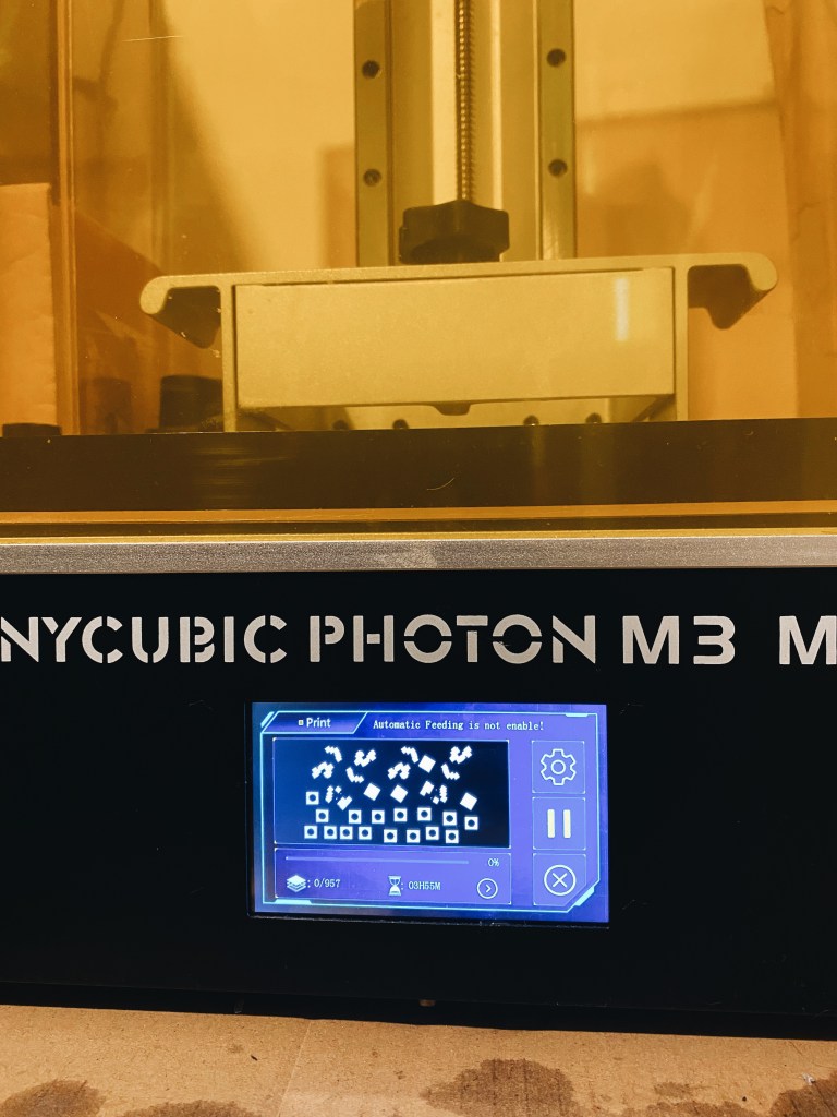 The process to actually making the pieces, started by mixing and loosening the resin in the vat and place it in the printer and tighten the plate. Then on the screen, we were able to see how and where on the plate they would print and how long it would take. These took roughly 5 hours to all print.