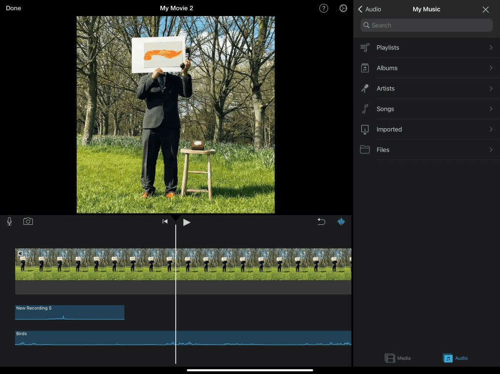 I used an app called iMovie. It was extremely easy to use – I just uploaded my video and added the sounds I wanted to it. To do this I actually recorded the sounds off of YouTube using Voice Memos, then I saved them as files making it easier to import them to iMovie. I then held and dragged the sound clips for them to play where I wanted. I inserted a clip of birds singing throughout the whole clip to cement the setting. I then added a phone wringing and being picked up, and the final sound added was a phone being hung up. I managed to sync the sounds to the video well but once I had exported the video, unfortunately the resolution was not as good.