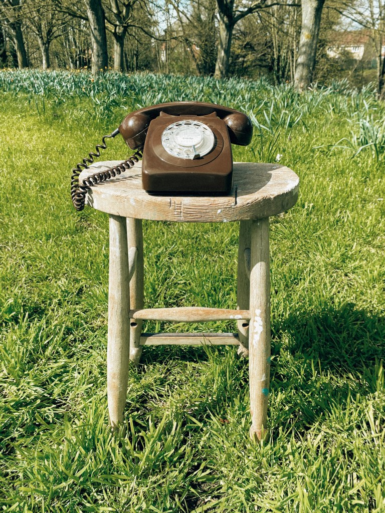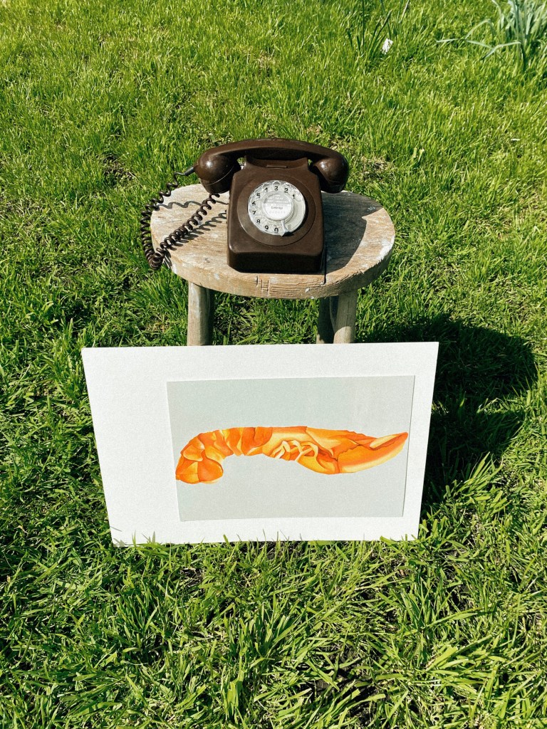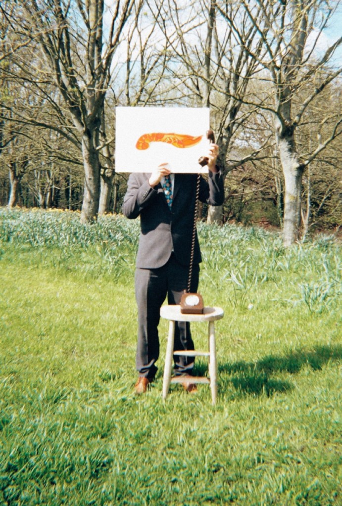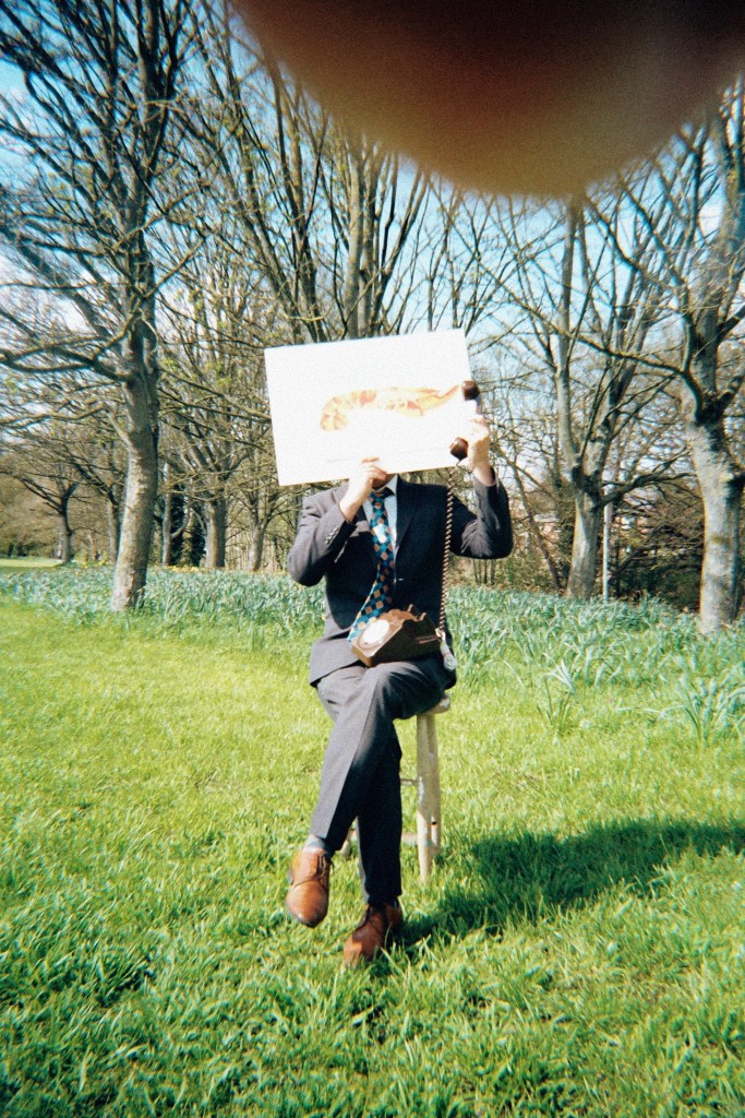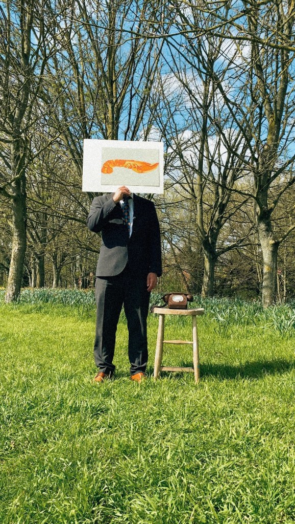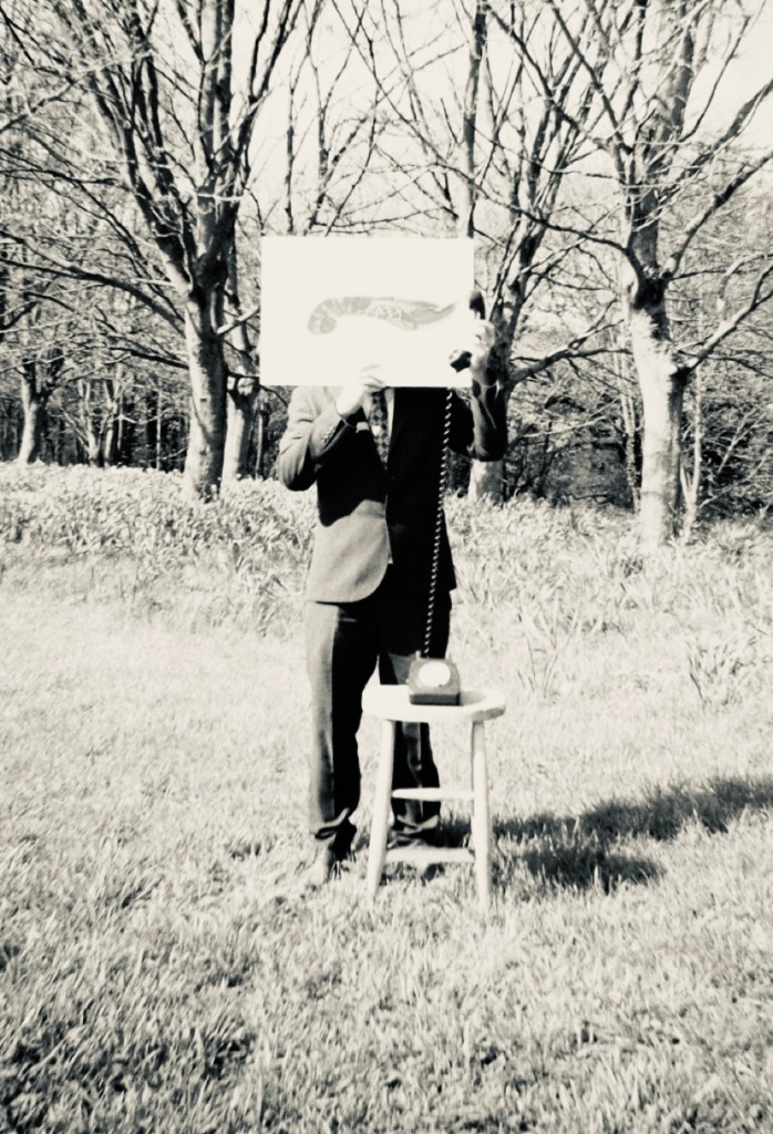 So my dad and I made our way to the park with a stool, an old phone, the lobster painting I did and my film camera. The main different]ce between my plan and the execution was the fact that I had planned for the subject to be sat down whilst the stool would have been next to him. The reason for this was because I wanted this piece to resemble Magritte’s Son of Man more closely. There is also a difference in the setup – I had planned to use a tripod to hold the paining in frame of the subjects head, however, unfortunately the wind was far too strong this day and it wouldn’t hold up.