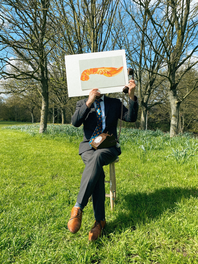 It is very discreet but the colour of the ties and shoes are very deliberate. There are blue and orange squares in the tie and the vibrant orange/brown shoes tie into the orange of the painting. As well as having thought about the aesthetic of the piece, there is also a hidden meaning behind the blue and orange tie – the Homarus gammarus, the European or common lobster, is blue while alive but becomes red when cooked. The idea of the painting is to make it look like a Polaroid – the permanence of a photograph is juxtaposed with the life of the lobster.
