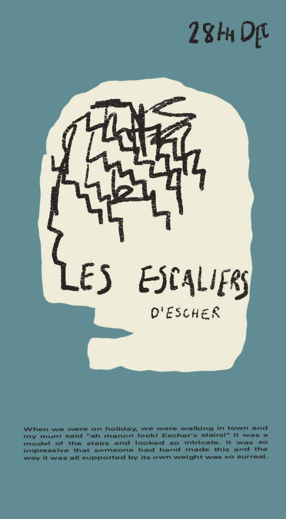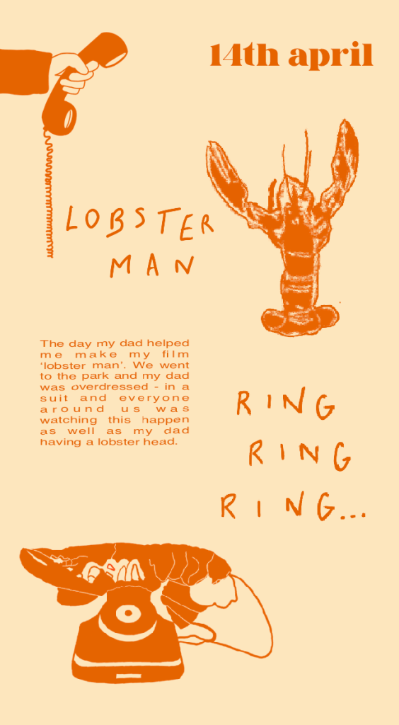 I wanted to include a diary within the instillation to emphasise the fact that it is a bedroom; seeing the theme of the exhibition, I had to make it surreal. So I recalled all of the surreal things that have ever happened to me and chose to combine them in a book. These include a bird living in the supermarket, my dad dressed up with a lobster head in the park and more. I chose to play around with sizing and ended up exaggerating the surreal theme by going with a smaller size. Below are the entries I made using PROCREATE.