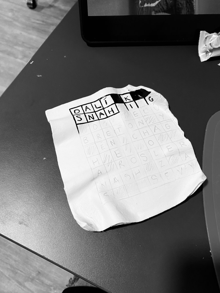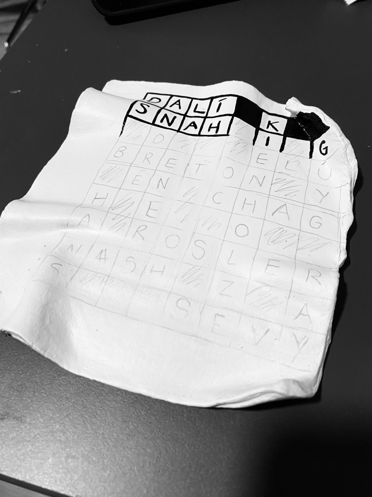 I decided I wanted to make a crossword for my instillation as they remind me of my grandad who always has the daily newspaper in his hand and is completing the crosswords from it. My grandad is the only one who will quiz me on artists and what they did, he always buys me books on new artists so I can discover more. I want this to be like an ode to my grandad who has been a huge inspiration to my work recently. I have chosen the theme of the crossword to be surrealist artists, including names like, Dalí, Breton, Bourdin, etc.