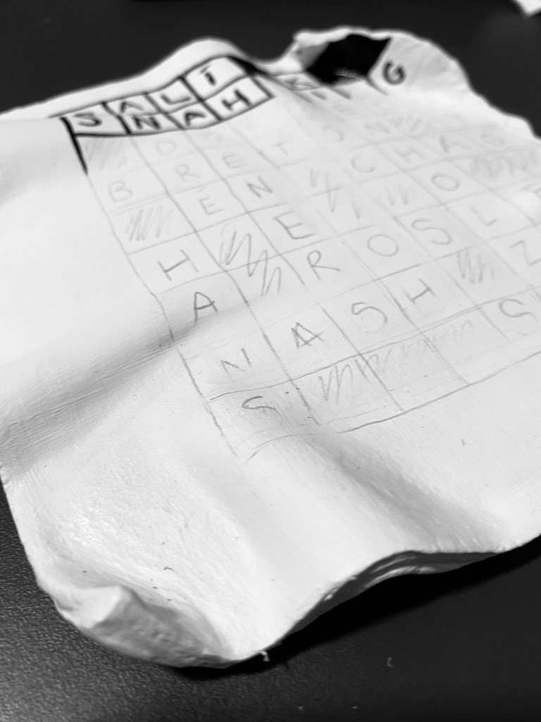I wanted the crossword to look like an old newspaper with creases on it. I started off with a ball of clay which I rolled out into a sheet about 1cm thick. I then trimmed the edges to make it seem like it was a tested crossword from the newspaper. Once I had finished trimming the edges, I placed pencils under the clay to create folds – giving it a slightly more realistic look.