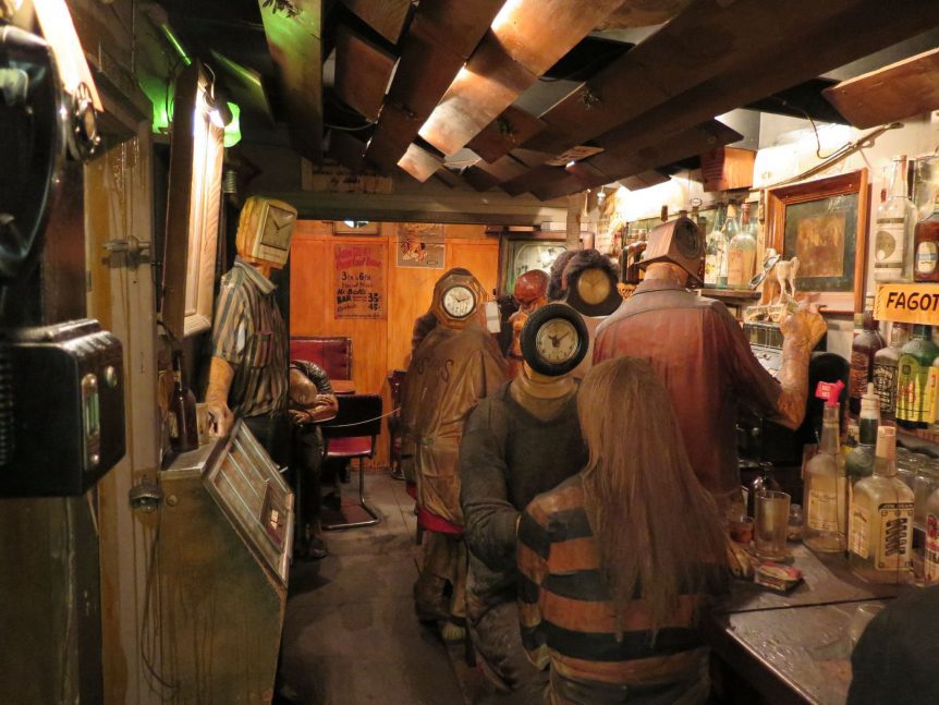 People’s heads are clocks, always reading 10:10. While the time outdoors is getting turbulent, the time in the pub is subjective and standing still. And is not standing at all, respectively.Kienholz painted his installations with a kind of synthetic resin that he mixed himself. That resin is slowly eating through “The Beanery” and making it degrade and decay. Some materials have already deteriorated, way faster than they would normally do – really emphasising the reason for the instigation- the passing of time. The way the artist has incorporated elements to depict aging and the passing of time is so cleverly thought out.